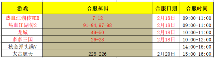 为优化服务器环境,进一步提高服务质量,并给玩家提供更多交流和互动的机会,部分游戏计划于每周二至周四进行合服(具体合服日期根据游戏实际情况而定)。合服为服务器数据互通,合服后登录入口不变。